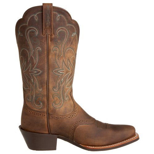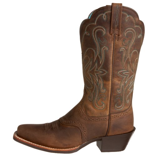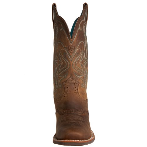 Ariat western boot comfort for the present day cowgirl Ariat ATS technological innovation supports and cushions as you move, selling great posture and decreasing fatigue. At the core of ATS technologies is the Ariat ATS composite shank. This patented shank layout reduces skeletal and muscular fatigue and damage. Mid-foot support minimizes metatarsal stress. The forked shank layout makes it possible for normal forefoot flex. The ATS footbed has a minimal-friction surface to safeguard from heat construct-up and blistering. Shock-absorbing gel forefoot cushion lowers skeletal affect pressure on knees, hips, and reduce back. Cupped footbed chassis gives torsional stability. This premium Ariat riding boot functions a distressed brown leather foot underneath a fancy stitched eleven\" matching leather shaft. Reinforced saddle vamp. Turquoise leather lined. Handy spur ridge. Double stitched Goodyear welt. Square toe.