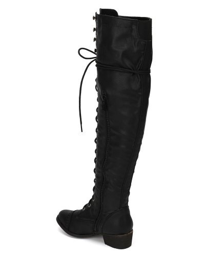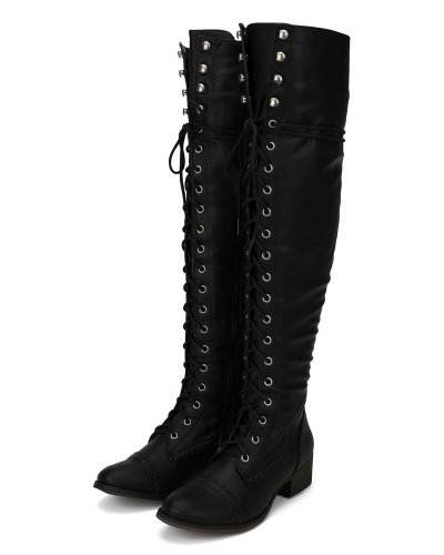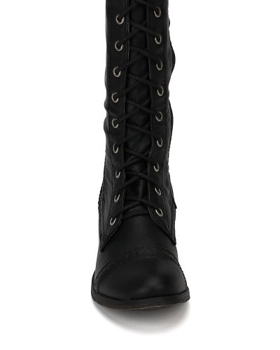 Breckelle AF57 Women Leatherette Military Lace Up Knee High Boot - Black (Size: 6.0)
