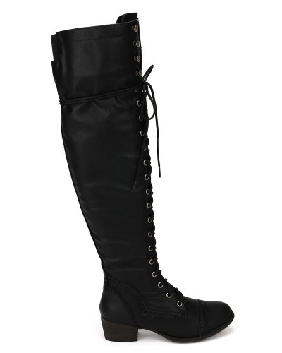 Finish off your look with an edgy touch in these military boots! Created with leatherette upper, round toe front, lower heel, knee higher construction, lace up closure at front of shaft, partial side zip for straightforward on/off, smooth interior lining, and finished with lightly padded insole.