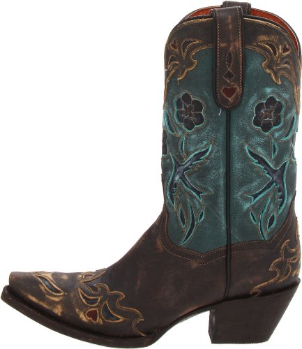 Dan Submit handcrafts this beautiful cowgirl boot for the present day western fashionista This boot characteristics a chocolate leather foot with tan wingtip overlay below a teal blue leather shaft with tan leather overlay at collar. Boot shaft measures 11\". Trend cowgirl heel. Lovely blue bluebird inlays and red heart inlays decorate shaft. Full leather lined. Single stitched welt. Effortless-on pull straps. Imported.