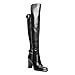 - Leather over-the-knee boot featuring stacked heel, snakeskin-print panel, and adjustable buckle straps on shaft
