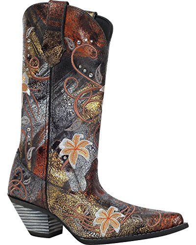 Select an affordable standard cowgirl boot from Durango Boots This women\'s Durango boot attributes a distressed, metallic leather foot below a matching 12\" leather shaft. Embroidery and rhinestones accent boots. Supportive tempered steel shank. 2 1/four\" cowgirl boot heel. Snip toe profile. Imported.