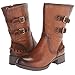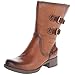 This mid-height boot functions dual buckle strap and a slight heel.