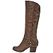 - Tall boot with slouched shaft featuring spur buckle behind stacked block heel