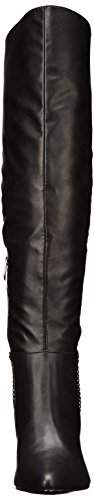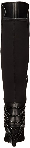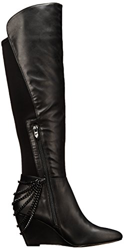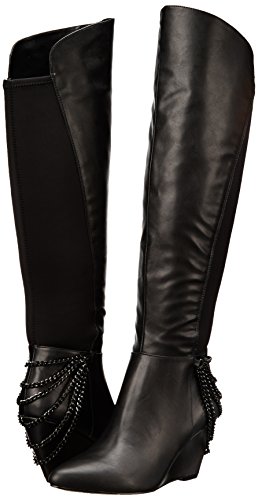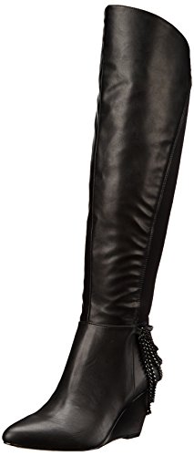 A svelte, form-fitting silhouette creates seductive allure in the Fergie Samantha wedge boot. Featuring an upper of faux leather with stretch material at the back, this women\'s tall boot is accented with an array of chains at the heel for a slightly hazardous seem. A cushioned footbed provides interior assistance, although a lightly treaded synthetic sole gives the Fergie Samantha knee-large boot secure traction to stride with imposing grace.