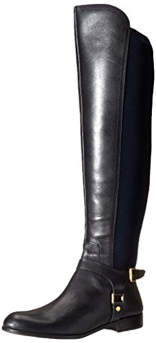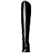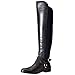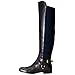 Sleek in excess of the knee boot with suede back panel. Decorative buckle and metal bits.