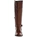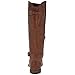 - Knee-high boot with curved cuff and decorative antiqued buckles at ankle and calf