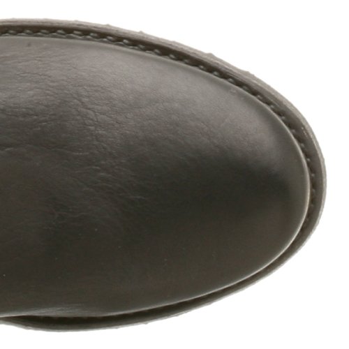 - Dual-buckle engineer boot with knee-high shaft and tapered seams at back
