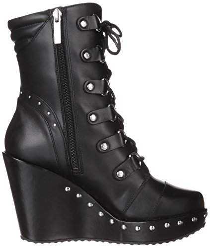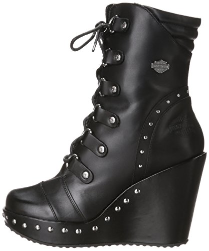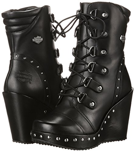 - Designed with fashion in mind with studs along and around the wedge front and back of shaft, riveted D-Ring lace eyelets, Harley? badging at top, and an embossed Harley? Bar & Shield logo on the heel