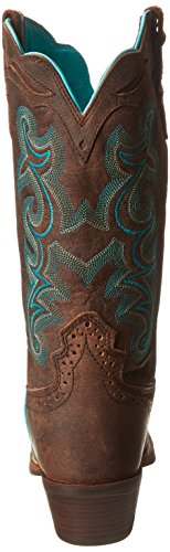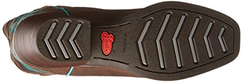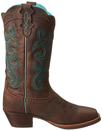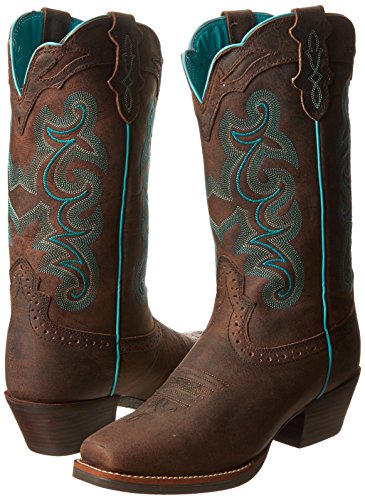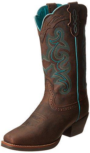 Introducing the Justin Silver cowboy boot assortment, inspired by placing today\'s cowboys and cowgirls in comfy boots This women\'s Justin Silver boot attributes a smooth, chocolate leather foot beneath a twelve\" leather shaft with vibrant turquoise embroidery. Turquoise leather piping accents shaft and collar. Cowgirl heel. Turquoise leather lining. Scalloped collar. Moisture-wicking footbed. Single stitched welt. Easy-on pull straps and up to date square toe. Imported.