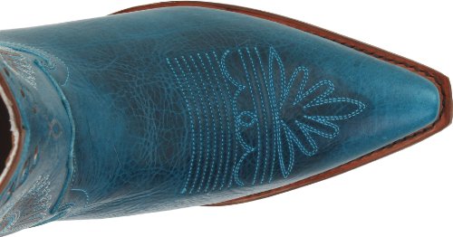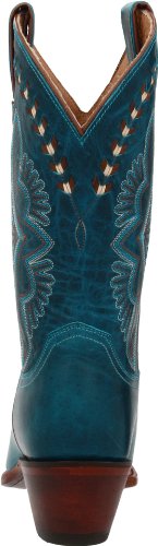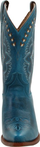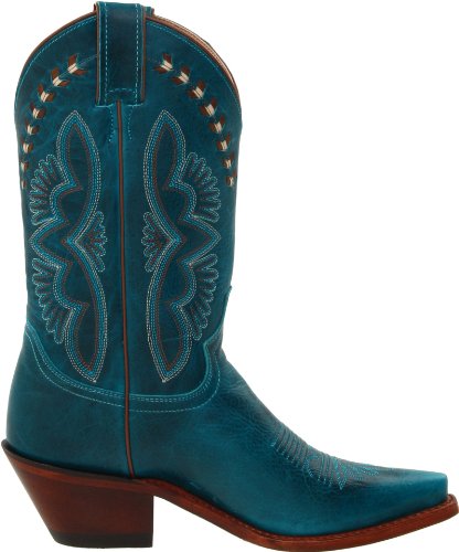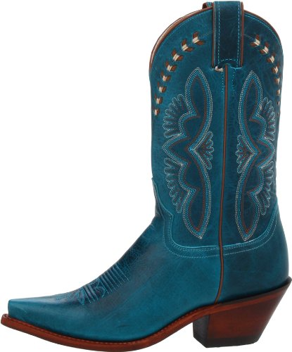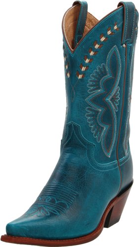 The Justin leather laced Torino cowgirl boot has significant western kick This boot attributes a smooth turquoise leather foot underneath a colorful, fancy stitched 11\" leather shaft with tan leather lacing accents at collar. Single stitched welt. Supple leather lining. Effortless-on pull straps and stylish snip toe profile. Imported.