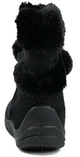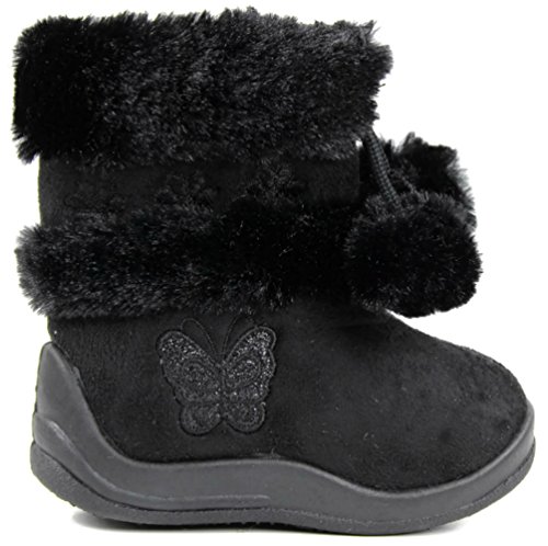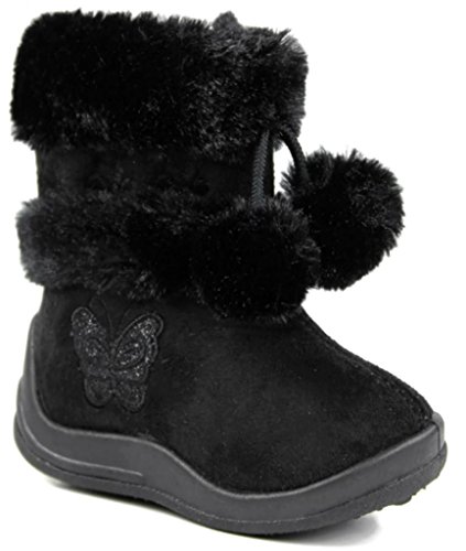 Flutter your cutesy style in these adorable boots! Short ankle boots featuring a soft animal friendly fur lining and decorative pom poms, triple flower accents and a shiny glitter butterfly embellishment on a smooth faux suede upper. Highest good quality materials. Easy slip on/off construction with a complete side zipper. Finished with a properly cushioned insole and a flat rubber tread sole for an all day relaxed put on. Limited stock. Grab all your princess\' fave colors whilst supplies final!
