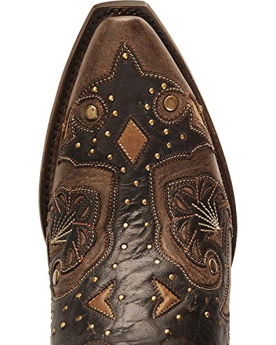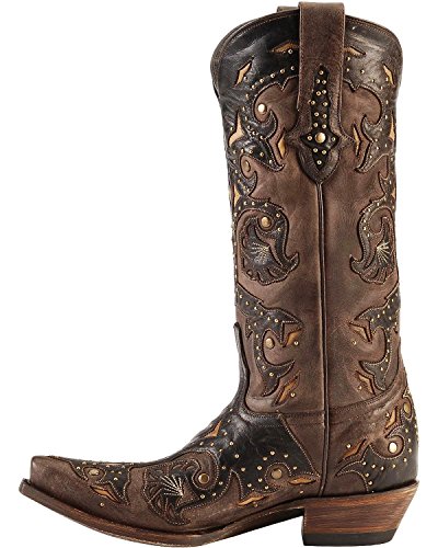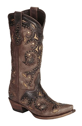 Aptly named for the 12 months Lucchese developed its first boots, the 1883 Lucchese brand is reminiscent of the standard hallmarks of handcrafted boots of the era. This women\'s Lucchese cowgirl boot attributes a chocolate leather foot with dark leather overlays embellished with studs below a matching twelve\" shaft. 1 3/4\" cowgirl heel. Single stitched welt. Leather lining. Fashion snip toe profile and straightforward-on pull straps. Imported.