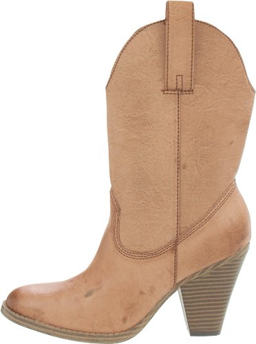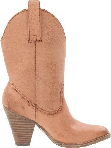 Manmade sole. Women\'s Madden Woman Snappiee Boot. A entertaining cowboy inspired western boot is the two fashionable and wonderful with a range of outfits. Faux leather upper in a slip on burnish boot style. Lightly cushioned insole. Mid calf cowgirl lower is eight.5 inched tall with pull tabs at the 14 inch opening.