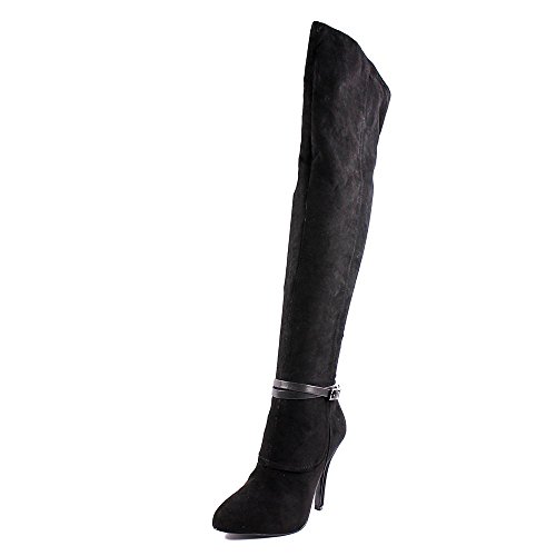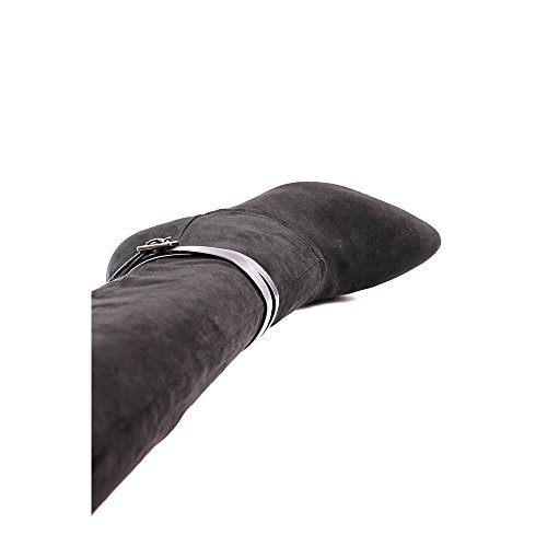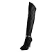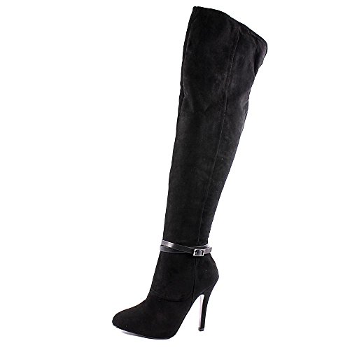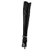 - Tall faux-leather boot with pointed toe featuring decorative straps at ankle and zipper entry at side