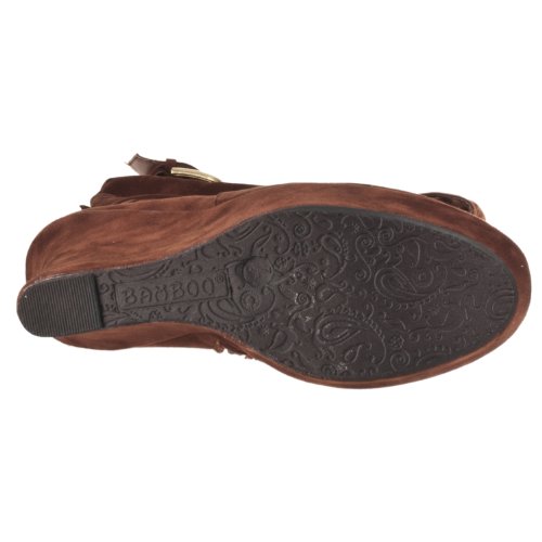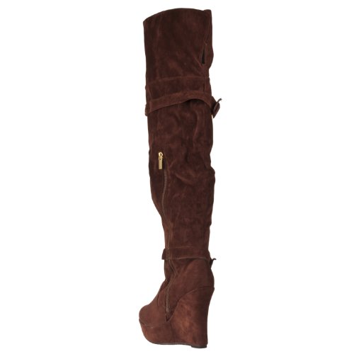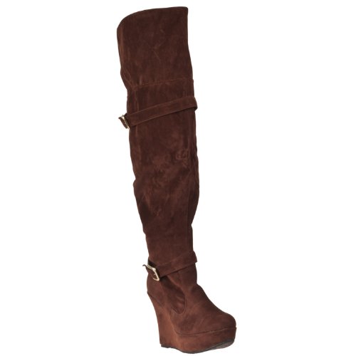 These \"Charli\" more than-the-knee boots by Riverberry are a scintillating addition to your footwear wardrobe. The faux suede upper is completed with tonal topstitching and a slightly slouchy seem. The four-inch wedge heel, platform sole, and rounded toe come together to create a sizzling silhouette. Decorative straps encircle the boot and are completed with shining buckles. The slightly padded footbed and within zipper develop ease of dress in and a touch of added comfort. Offered in black colour option.