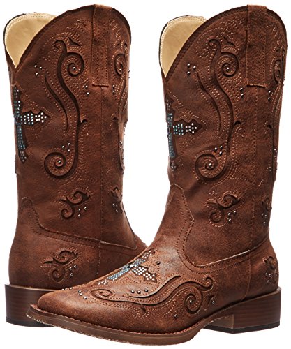 Include some sparkle to your stage with these fashionable boots by Roper The women\'s cowboy boots are made of high-top quality faux leather with sparkly crosses and decorative accents. A modern day square toe profile seems great for any event.