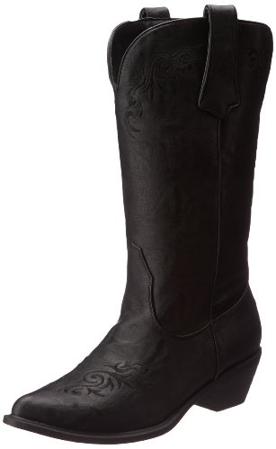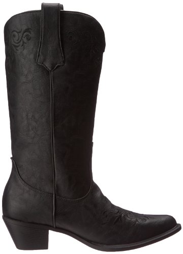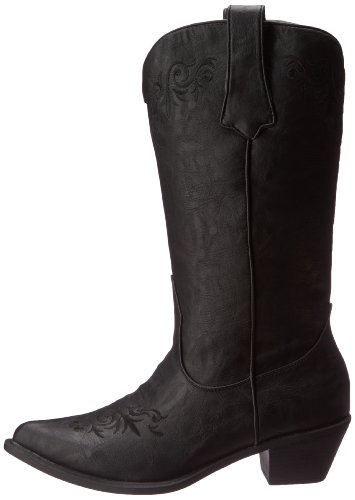 Roper provides you the seem of a designer cowboy boot, at an incredible low value These women\'s boots characteristic a black faux leather foot with fancy vine embroidery underneath a matching faux leather shaft. Faux leather lining. Single stitched welt. Cowgirl heel. Straightforward-on pull straps and pointed toe. Imported.