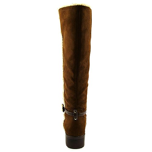 - Tall boot featuring stacked heel and faux-leather strap with gold-tone toggle accent around ankle;Faux-shearling lining and trim