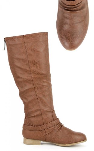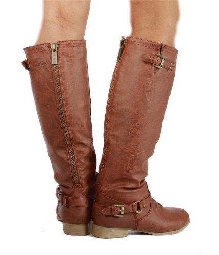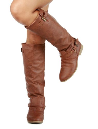 Spice up your cold weather seem in these trendy riding knee high boots. Featured round toe front, dual buckles decor on shaft, slightly slouchy shaft, and lower heel. Finished with cushioned insole and smooth interior lining. Complete side zipper closure for effortless on/off.
