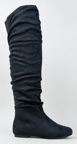 VICKIE-HI Basic Casual Over the Knee Thigh High Slouchy Flat Boot, Black Suede, (8 US)