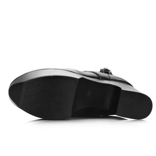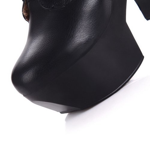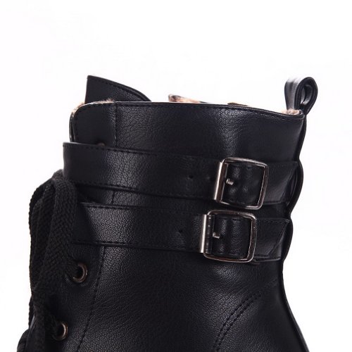 WeenFashion Women's Round Toe High Platform Ankle Strap Lace-up Closure Chunky Heels PU Boots with Zipper, Black, 8 B(M) US