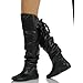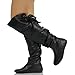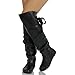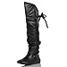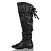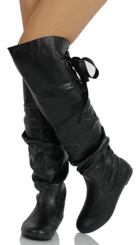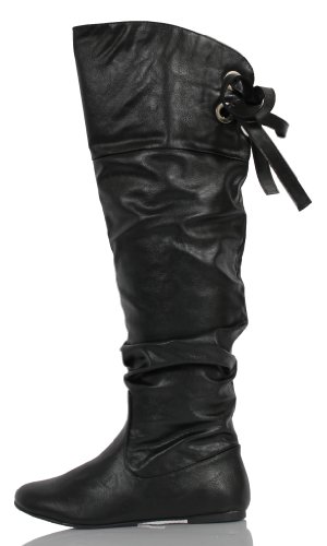 Black Leatherette over the knee flats characteristics round toe, stitching detailing, back lace-up. Cushion insole with traction sole.Shaft height measures around 21 in which includes heel. Opening circumference 16 one/2\" and calf circum. 15\" ( dimension seven)