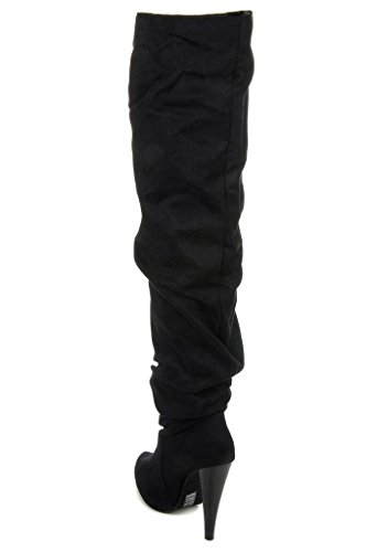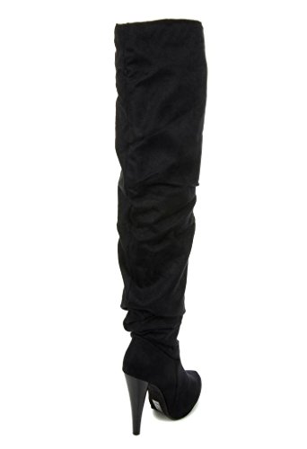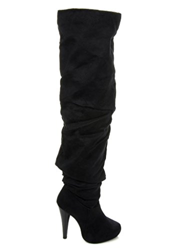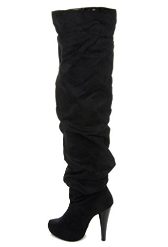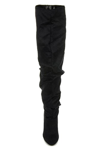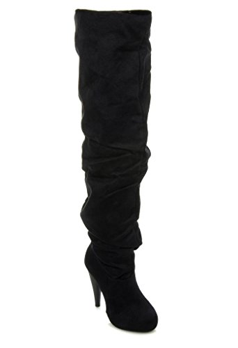 Women's Thigh High Slouchy Ruching Heel Boots MCKAY BLACK